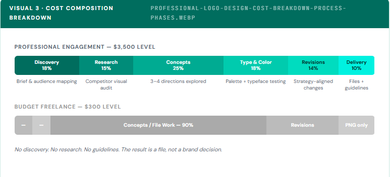 “Where the investment goes, how a professional logo design project distributes time and effort versus a budget engagement.”