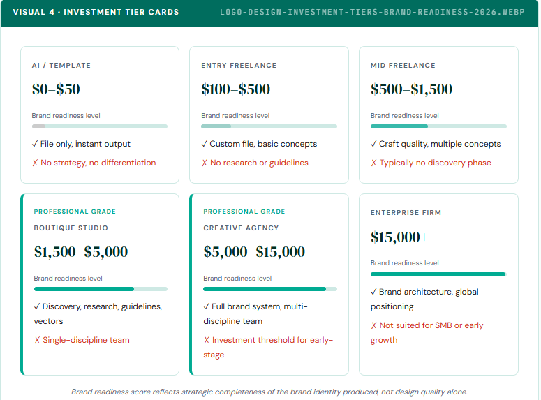 AI tools and template platforms ($0–$50) produce a logo file in minutes. For a brand launching a side project, testing a concept, or bootstrapping to first revenue, that speed has genuine utility. The honest limitation: every output comes from the same algorithm trained on the same visual data. Differentiation is structurally impossible at this tier.