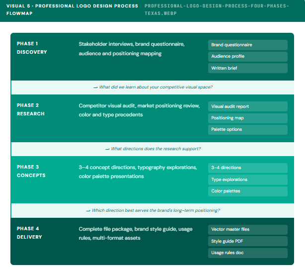 Full-service creative agencies deliver what neither of the above can: a multi-disciplinary team where strategy, design, and production run simultaneously from the same brief. For a growing Texas business entering a competitive market or positioning for a capital raise, the research-first output of an integrated agency engagement produces an asset that performs across every channel from day one. That is what structured, process-led brand logo services actually deliver, not just a file, but a documented visual strategy that informs every design decision that follows it.