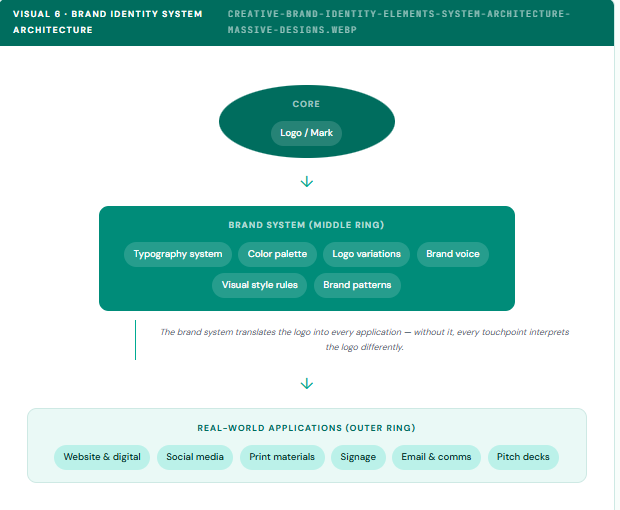 “Brand identity system architecture, how a professional logo connects through a visual system to every real-world brand touchpoint.”