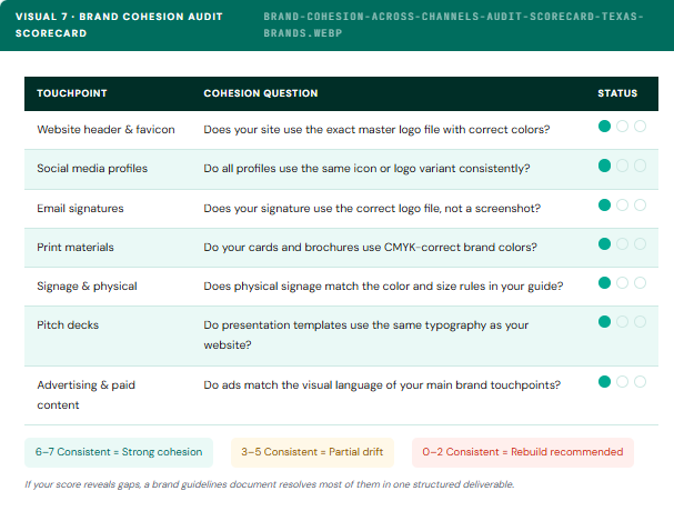 For DFW brands operating simultaneously across digital and physical touchpoints, cohesion requires a reference document. A visual identity system and content strategy must work in parallel, the logo defines the visual register, while content messaging defines the voice register. Maintaining both consistently is where growing brands build compounding brand equity. Understanding how those two systems interconnect is addressed directly in this content strategy resource for Texas markets.