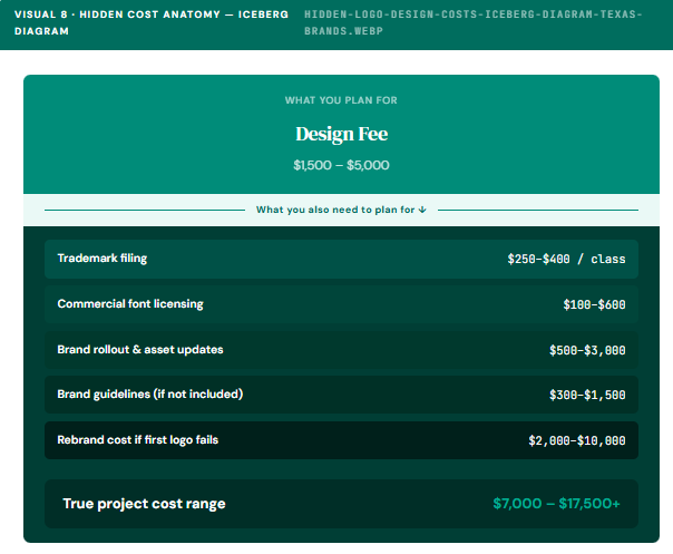 Brand rollout costs catch founders off guard at implementation. Updating a website header, social media banners across four platforms, email signature templates, proposal decks, business cards, and any physical signage after a rebrand routinely adds $500 to $3,000 in execution costs alone. Furthermore, the compound cost of rebranding when a first logo fails is the largest hidden expense of all. A brand that invested $300 in an AI-generated logo and needs a full rebrand three years later faces $4,000 to $8,000 in design cost plus full rollout expenses — making the total cost of the budget decision two to four times what the professional option would have cost at the outset.