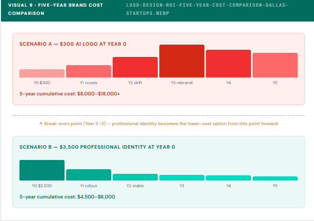 “Five-year brand cost comparison, how a $300 AI logo versus a $3,500 professional identity plays out in total cost over time for a growing startup.”