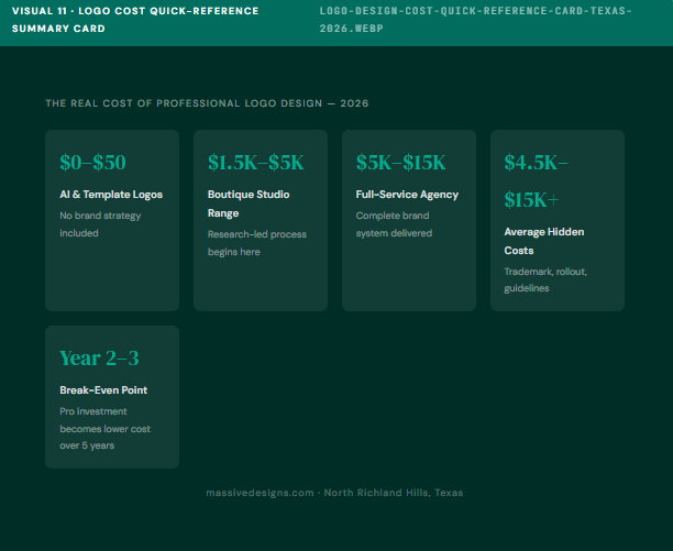 “Five numbers every Texas founder needs before commissioning a logo — reference card from Massive Designs, 2026.”