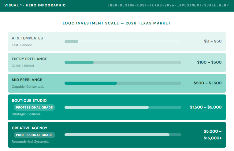 Ans. Professional logo design in Texas at the boutique studio level runs between $1,500 and $5,000 in 2026. Creative agencies with full brand strategy capabilities typically charge between $5,000 and $15,000. Texas market rates have risen approximately 10 to 12 percent since 2023, reflecting growing demand from the DFW startup ecosystem. Entry-level freelancers and AI tools remain available at $100 to $500 and $0 to $50 respectively, though neither tier includes the research and strategy work that drives long-term brand performance.